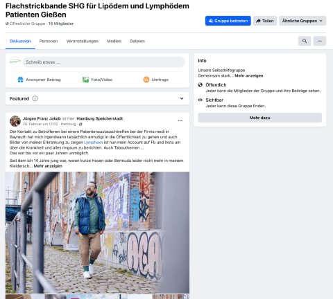 🌟 Neu bei Facebook: Die Flachstrickbande! 🌟 Liebe Mitglieder und Unterstützer, wir freuen uns, euch mitteilen zu können, dass Die Flachstrickbande jetzt auch auf Facebook zu finden ist! 🎉 Als Selbshilfegruppe für alle, die mit den Herausforderungen des Lip- / Lymphödems zu kämpfen haben, möchten wir einen Raum schaffen, in dem wir uns gegenseitig unterstützen, stärken und inspirieren können. 💪 Folgt uns auf Facebook, um über inspirierende Geschichten auf dem Laufenden zu bleiben. Lasst uns gemeinsam eine positive Veränderung in unseren Leben bewirken! 💬 Klickt auf den Link unten, um unserer Gruppe beizutreten und Teil unserer wachsenden Community zu werden. Zusammen sind wir stark! 💙 Wir freuen uns darauf, euch dort zu sehen! Eure Flachstrickbande |